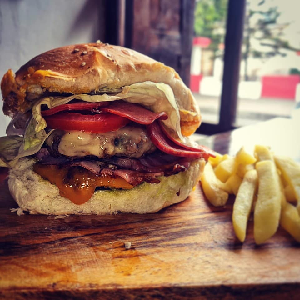 Doble carne, tocino, peperoni, dos quesos, papas fritas.